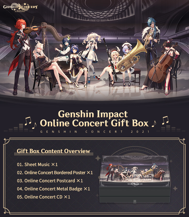 Genshin impact online concert gift box. Genshin Impact is miHoYos first ever open-world game where beliefs in The Seven converge in the fantasy world of Teyvat. The Promise of a Worldly Encounter is a Fan Creation Event to celebrate the upcoming one year anniversary of Genshin Impact. The game features a massive gorgeous map an elaborate elemental combat system engaging storyline characters co-op game mode soothing soundtrack and much more for you to explore.